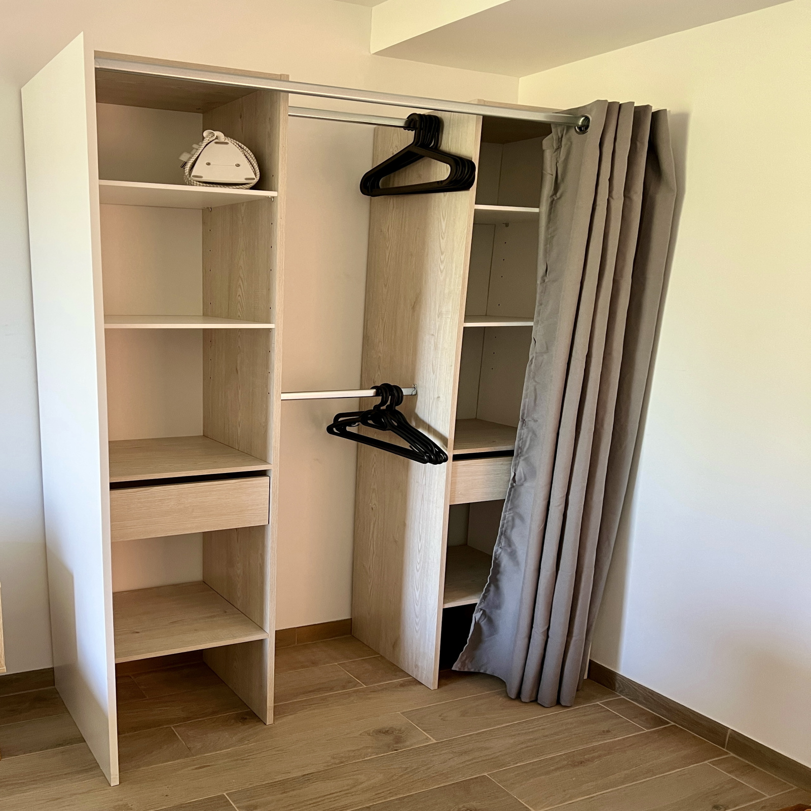 Logement climatisé avec baie vitrée et volets électriques occultants.