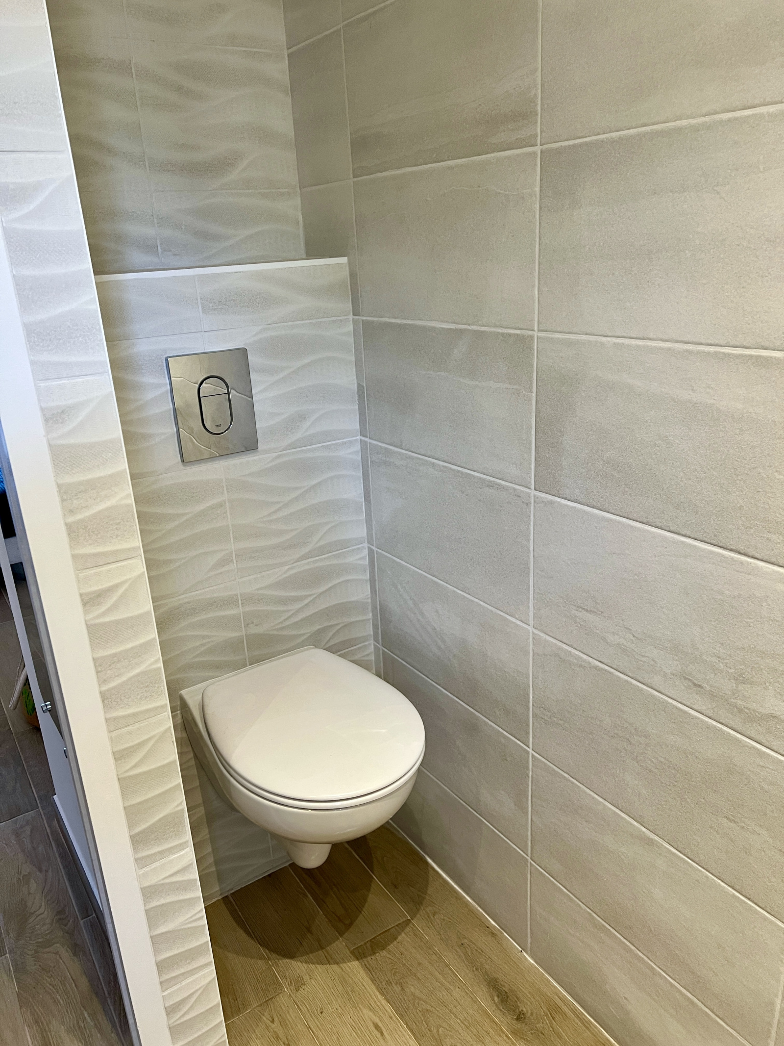 Salle de bain avec rangements, wc suspendu et baignoire.