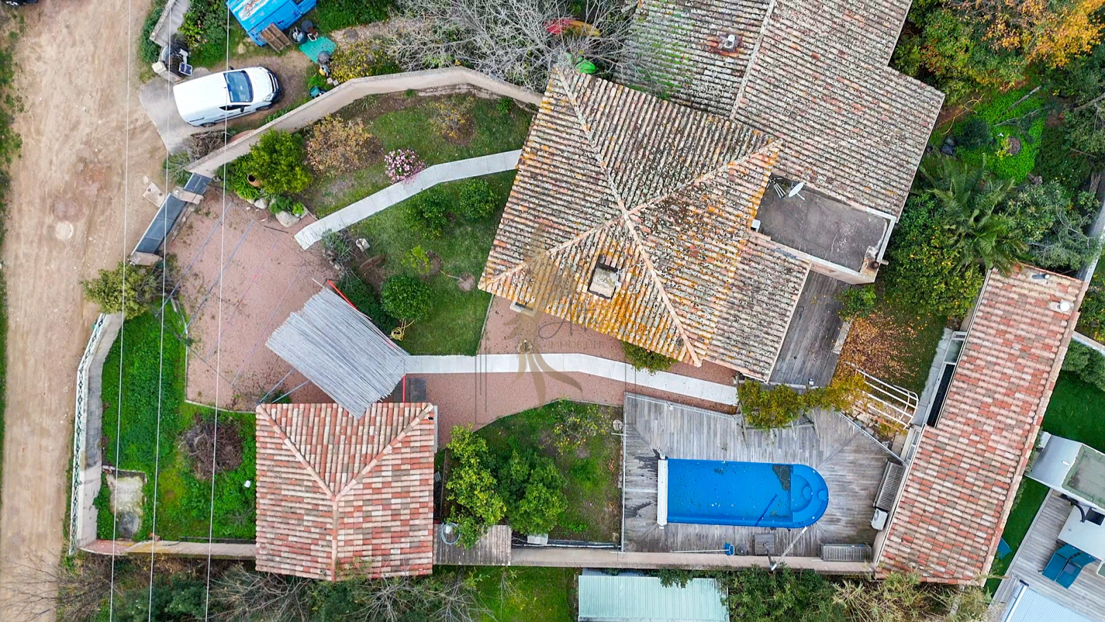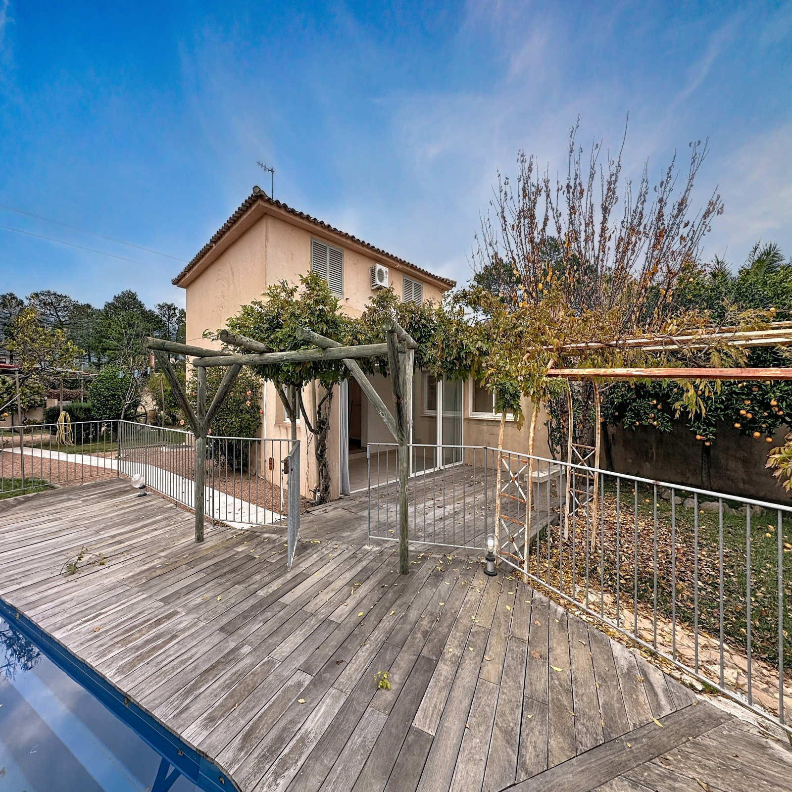 Le jardin soigneusement aménagé invite à la détente avec une piscine, une cuisine d’été, et de beaux espaces verts agrémentés d’arbres fruitiers.